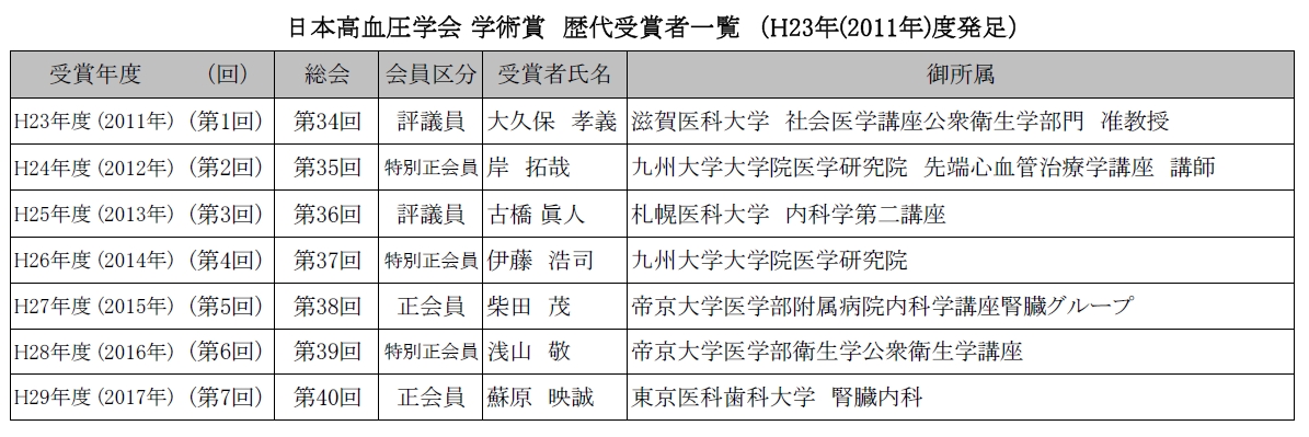 会員で高血圧学の進歩に寄与する顕著な研究を発表し、将来発展の期待される研究者に対して授与する。