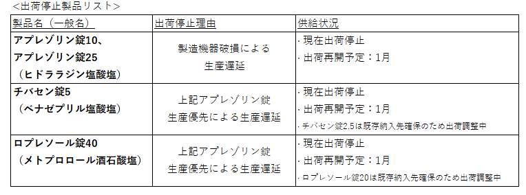 【サンファーマ株式会社】アプレゾリン錠およびチバセン錠 出荷停止について