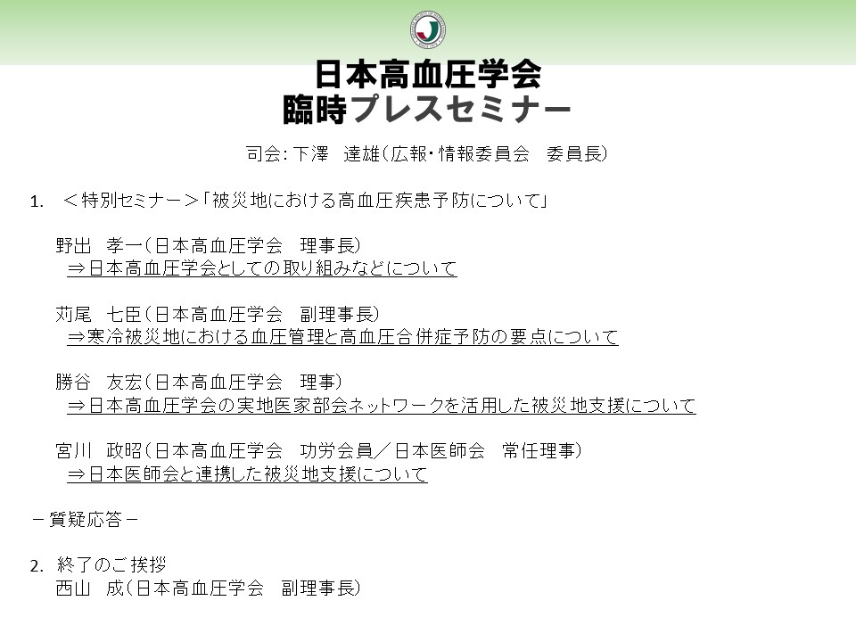 災害関連死などを予防するためのメディアへの情報提供が急務であると考え、災害時における高血圧を中心とした循環器疾患予防や災害の対応活動などについて本日プレスセミナーを行いました。