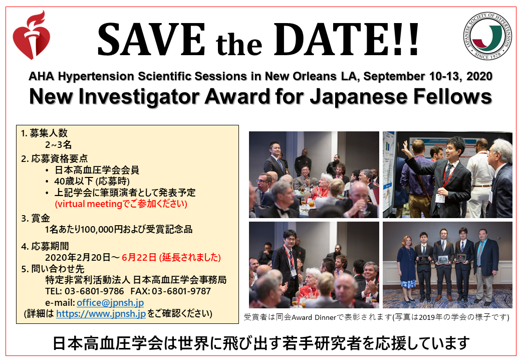 2017年より日本高血圧学会ではAHAと連携して更なる国際化の推進および若手の活性化を目的とし、同学会にて発表する優秀な若手研究者にNew Investigator Awardを贈呈しております。