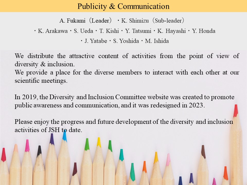 Building upon our past initiatives, we aspire to plan and promote distinctive activities that are unique to the JSH. Diversity promotion has evolved beyond mere gender equality and now encompasses the concept of ensuring and providing equity in various aspects of diversity, including nationality, disability, age, and more. Recognizing and respecting diversity within our organization, i.e., inclusion, is crucial.