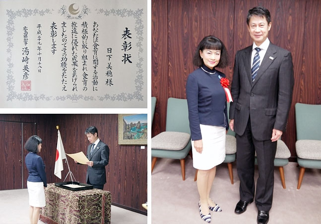 2017年10月18日、日下美穂先生が減塩サミットin呉2012をはじめとする減塩活動を通して、こどもから大人まで県民の食育に貢献されたことが評価され、広島県食育推進功労者県知事表彰を受賞されました。広島県では2025年まで、「1.減塩、2.野菜を食べる、3.孤食を減らす」の3本柱の達成を目標に食育活動に力を入れるそうです。